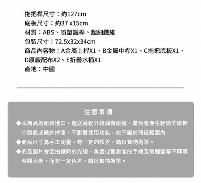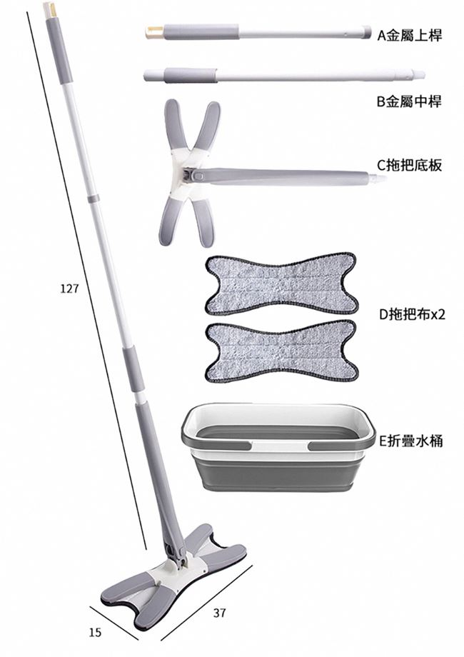 內容物 | A金屬上桿X1、B金屬中桿X1、C拖把底板X1、D原廠配布X2、E折疊水桶X1 |