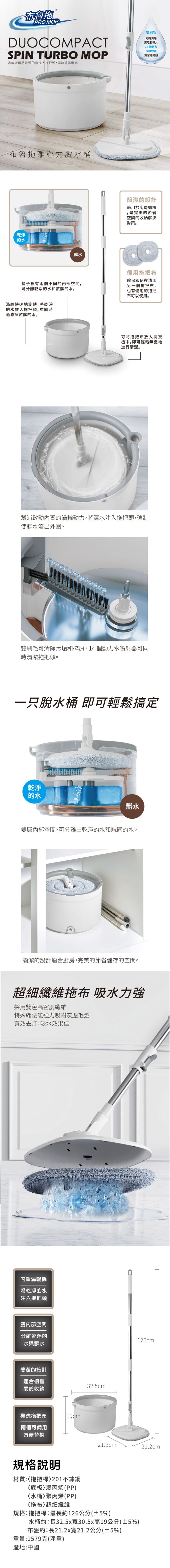 包裝內容/商品規格 | 拖把桿-最長約126公分(±5%)、底板(布盤)-長21.2x寬21.2公分(±5%)、水桶-長32.5x寬30.5x高19公分(±5%) |