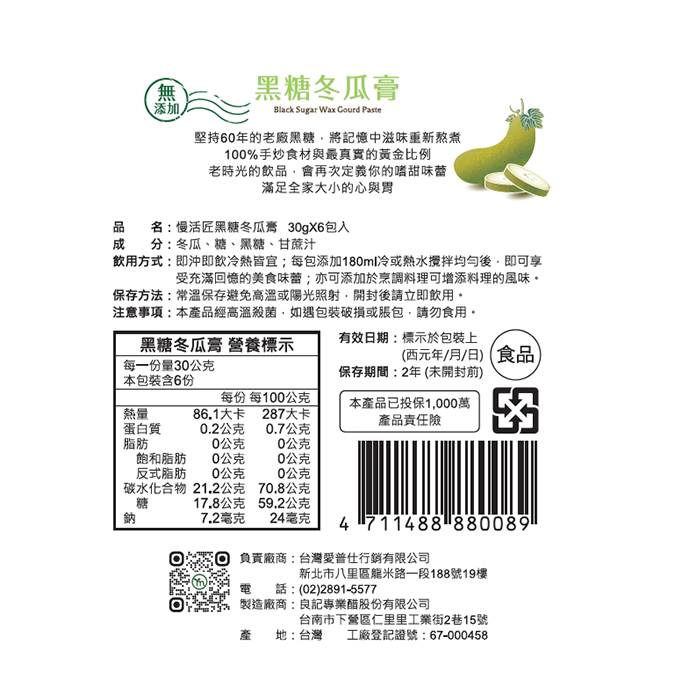 慢活匠 黑糖冬瓜膏30g*6入裝