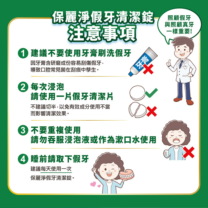 【使用說明】 【注意事項】 ★「消費者使用前應詳閱醫療器材說明書」 使用前詳閱產品說明書、警語及注意事項 ★警語:本產品含有persulfate成份,使用後可能造成過敏反應,包括刺激感、組織傷害、疹子、蕁麻疹、牙齦變軟、呼吸問題、低血壓。 ★如發生任何前述反應時,應將假牙移除並盡快向醫師諮詢。本產品係於容器中使用,切勿放入口中咀嚼、漱口、或吞食,並請於使用後將假牙徹底沖洗乾淨。 醫療器材品名:保麗淨假牙清潔錠 (未滅菌) 廣告字號:北市衛器廣字號第111100203號 販售業者資料- |